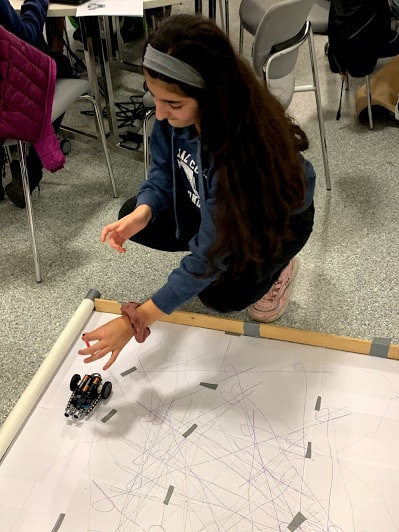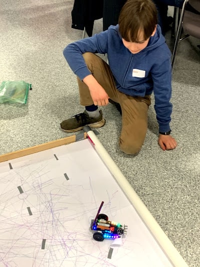 As soon as I arrived at CoderDojo, I set up my area and was eager to start the workshop straight away. Once the workshop was up and running, I noticed that everyone was relishing experimenting with the code they had just learned, and were either combining different elements of other worksheets or using the different features of the Bitbot, to try and make the program more interesting, which for me was great to help out and to observe. Since the Bitbot has a pen holder feature to it, I set up a little area, where people could test-run their code and see what patterns their Bitbot would make with a felt tip pen mount on the back. I remember a particular girl trying to make a star shape, after many different test runs and through resilience, she managed to get there. This just goes to show if you put your mind to it, you can achieve anything. Always give it a go and try not to give up!